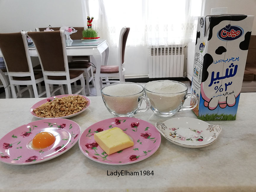 - مغز گردوی نیم کوب شده (برای روی دسر): به میزان دلخواه (من 7 عدد مغز استفاده کردم)