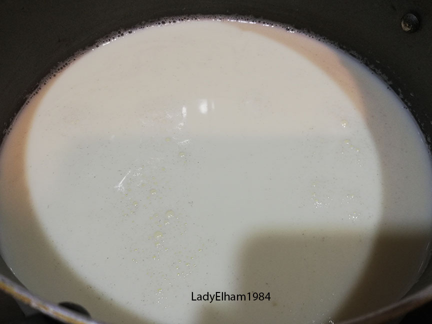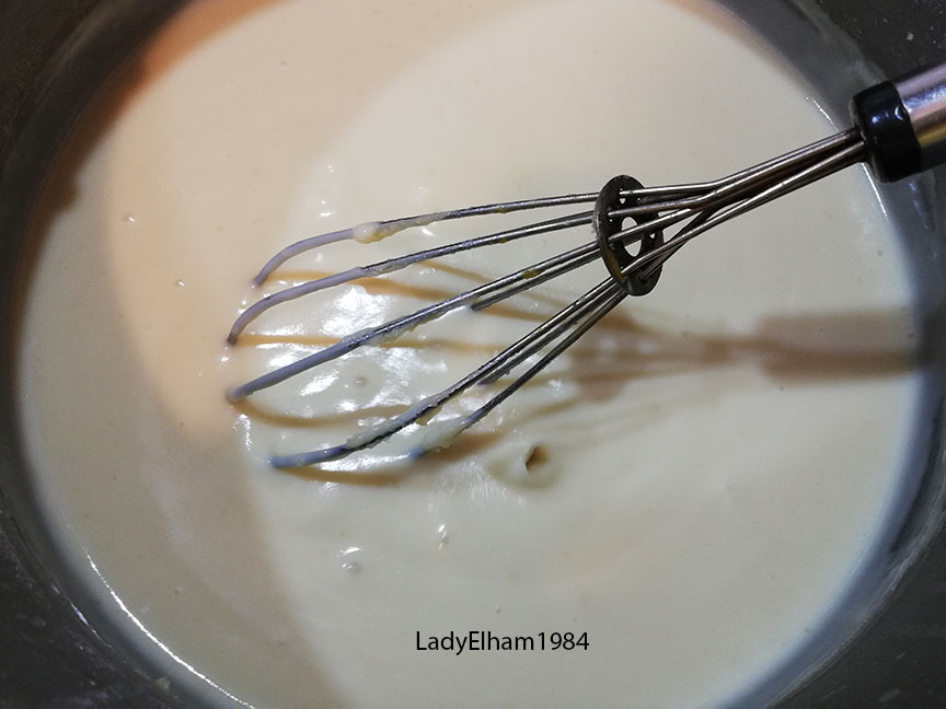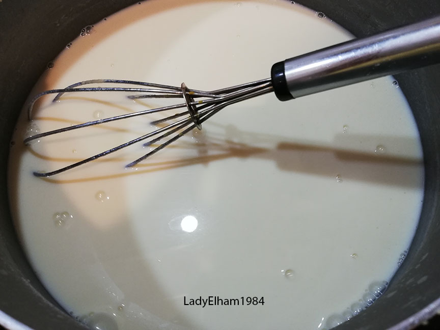 3- اکنون شیر (ولرم رو به سرد) را به قابلمه آرد افزوده و با همزن دستی مدااااام هم میزنیم. در این مرحله حرارت حتما باید ملایم باشد تا آرد گوله گوله نشود و دوم اینکه بلافاصله آنقدر با همزن دستی، هم میزنیم تا آرد تفت خورده کاملا در شیر حل شود.