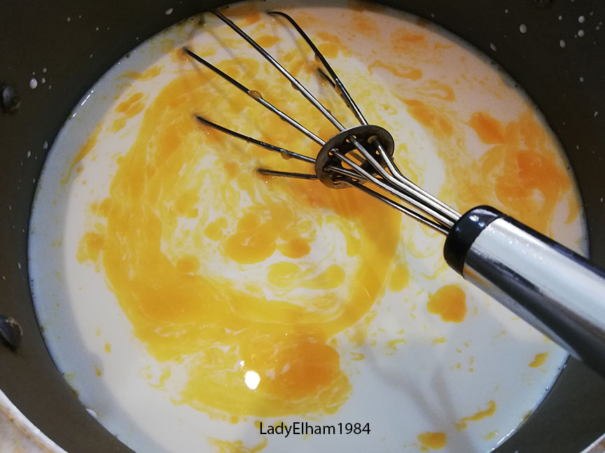 1- شیر و شکر را داخل قابلمه ای میریزیم. زرده را با چنگال به هم میزنیم تا از لختگی در بیاید و به مواد بالا اضافه کنید. اکنون مواد را روی حرارت ملایم میگذاریم و با همزن دستی مدام هم میزنیم. در این مرحله میخواهیم شکر و زرده کاملا در شیر حل شود. به عبارتی در این مرحله فقط شیر را ولرم (رو به سرد) میکنیم. یعنی چیزی پخته نمیشود و نمی جوشد. فقط ولرم میشود، در حدیکه انگشتتان را بزنید، احساس کنید کمی گرما دارد. مواد سفید رنگ میشود و کمی کف میکند. قابلمه را کناری قرار میدهیم.