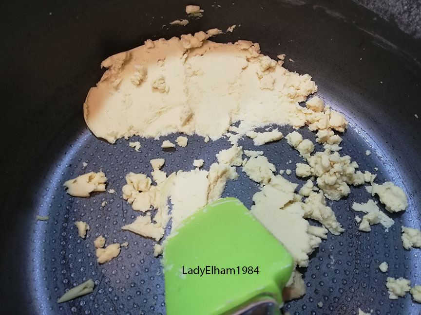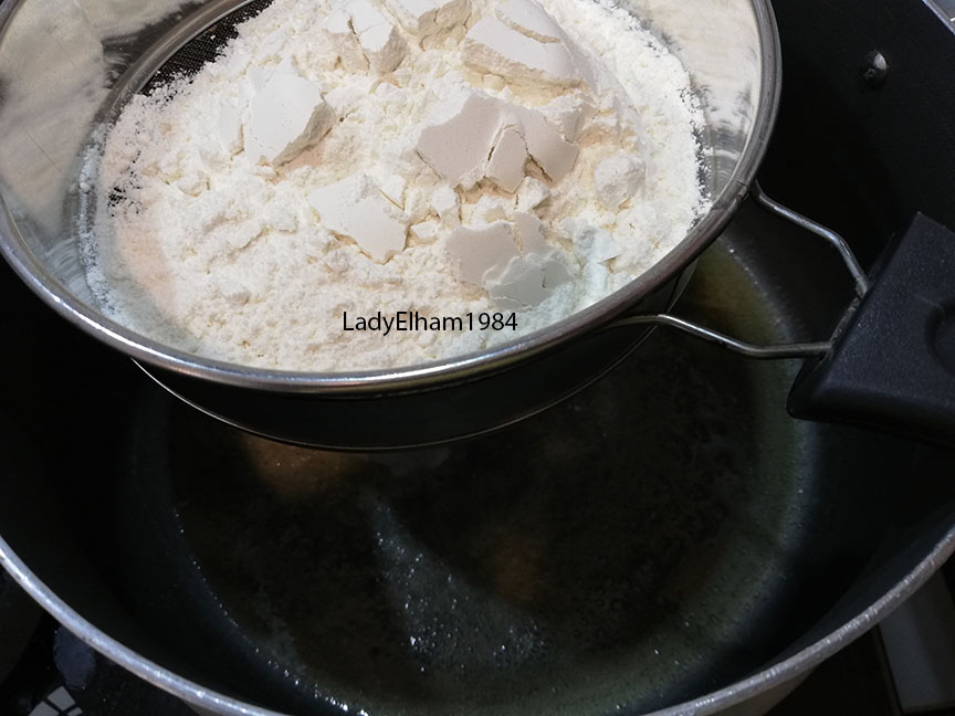 2- اکنون کره را داخل قابلمه دوم ریخته و روی اجاق قرار میدهیم. حرارت ملایم باشد، کره که آب شد، آرد را درون قابلمه الک کرده و با قاشق چوبی یا لیسک، آرد را تفت میدهیم. (در این مرحله حرارت را میتوانیم کمی بالا ببریم تا آرد زودتر گرم شود). با این تفت دادن میخواهیم خامی آرد رفع شود و آرد کمی تغییر رنگ دهد. بعد اینکه آرد کمی گرم شد، دوباره حرارت ملایم باشد (چون نمیخواهیم کره بسوزد و بو بگیرد). به تفت دادن ادامه میدهیم تا بوی آرد دربیاید و آرد تغییر رنگ بدهد. برای من حدود 5 دقیقه زمان برد. بعد اتمام تفت خوردن و رسیدن به میزان دلخواه، حرارت را کاملاٌ ملایم میکنیم.