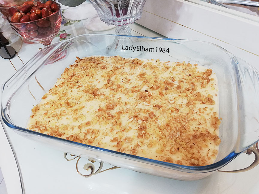 7- اکنون مواد را داخل ظرف خیس شده (من پیرکس 33*23 استفاده کردم) میریزیم و با لیست رویش را صاف میکنیم، مایه که کمی رویه بست، گردوهای نیم کوب را رویش میریزیم. (مواد خیلی سرد شود، گردو به سطح دسر نمیچسبد).